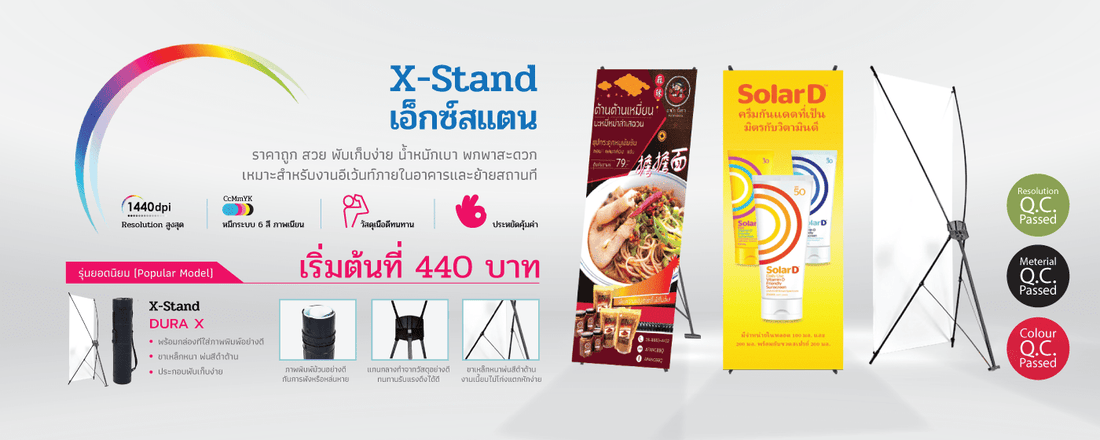 Looking for good quality advertising media that meets the problem, low price, recommend Ek Stan (X Stand) , good work, quality, reliable , clear color printing with 6 color printer, smooth picture, guaranteed clear, beautiful, fresh, excellent quality, fine print, 1440 DPI, laminated coating. On the printed surface, anti-scratch, waterproof, good work, no disappointment. Advertising billboard material X Stand (Ex-Stan), good quality, standard , cheap price , angled support rod Sturdy stand with good quality carrying case. Good work, reliable quality, urgent work, urgent work, make it fast, guarantee work standards Urgent work does not reduce quality. definitely not disappointed
