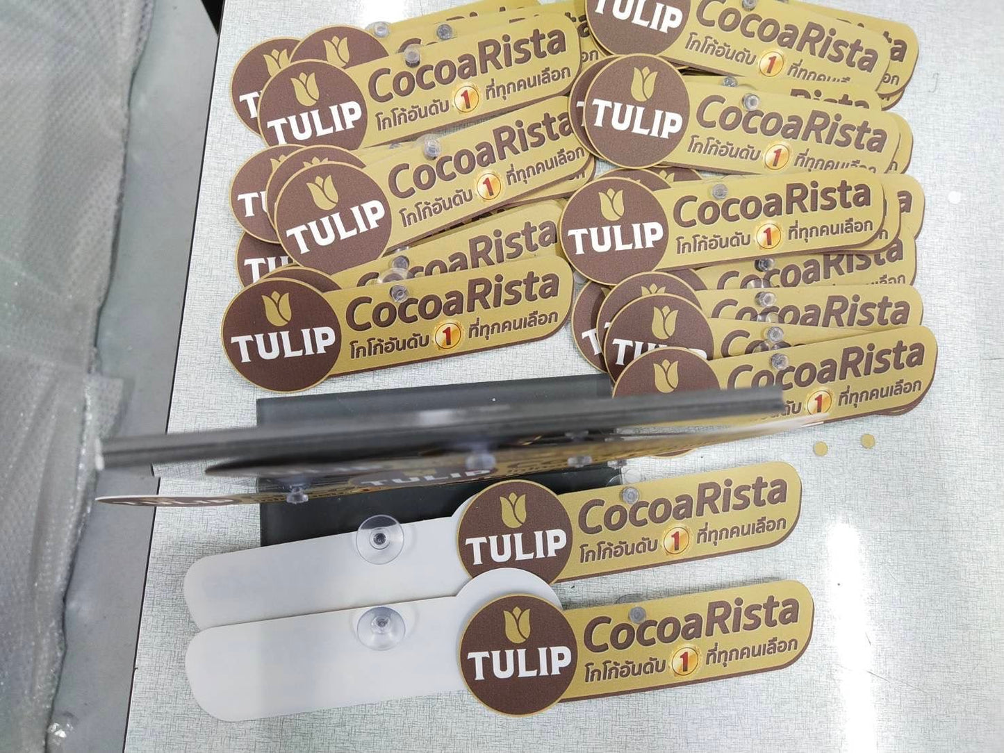 Get a glass suction cup sign attached to the glass. Our sucker labels, plastic labels, and display labels are perfect for hanging on glass surfaces or shelves. These labels are easily attached with a vacuum suction cup, making them ideal for sales promotions or product labeling in front of the store, without the need for glue.