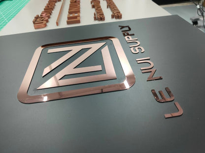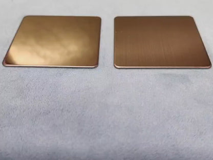 - Stainless steel sign, shiny texture, mirror or hairline, purple, gold, pink gold, bronze