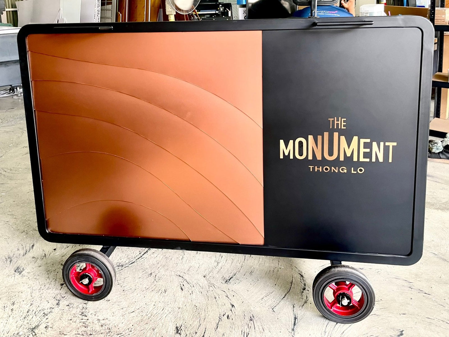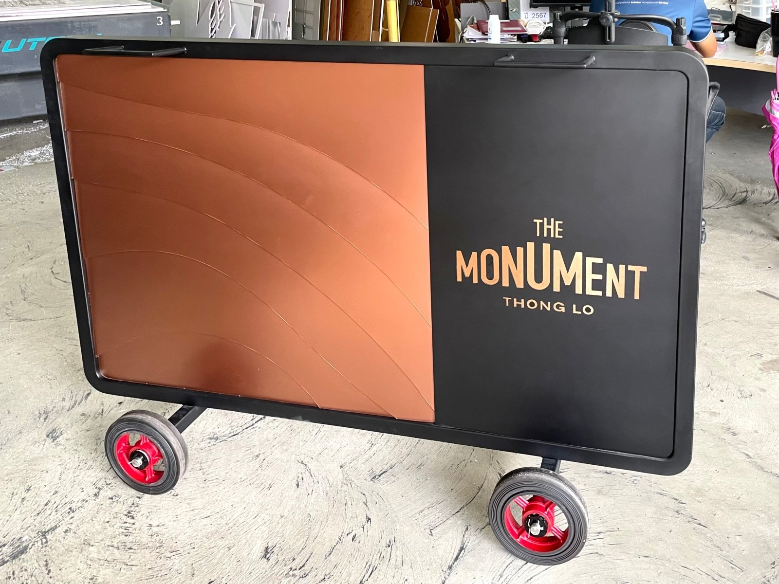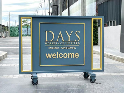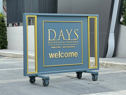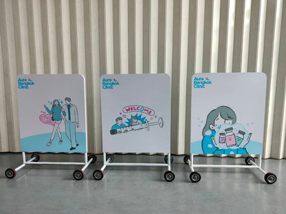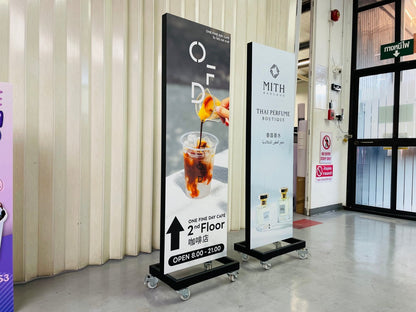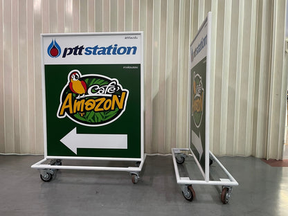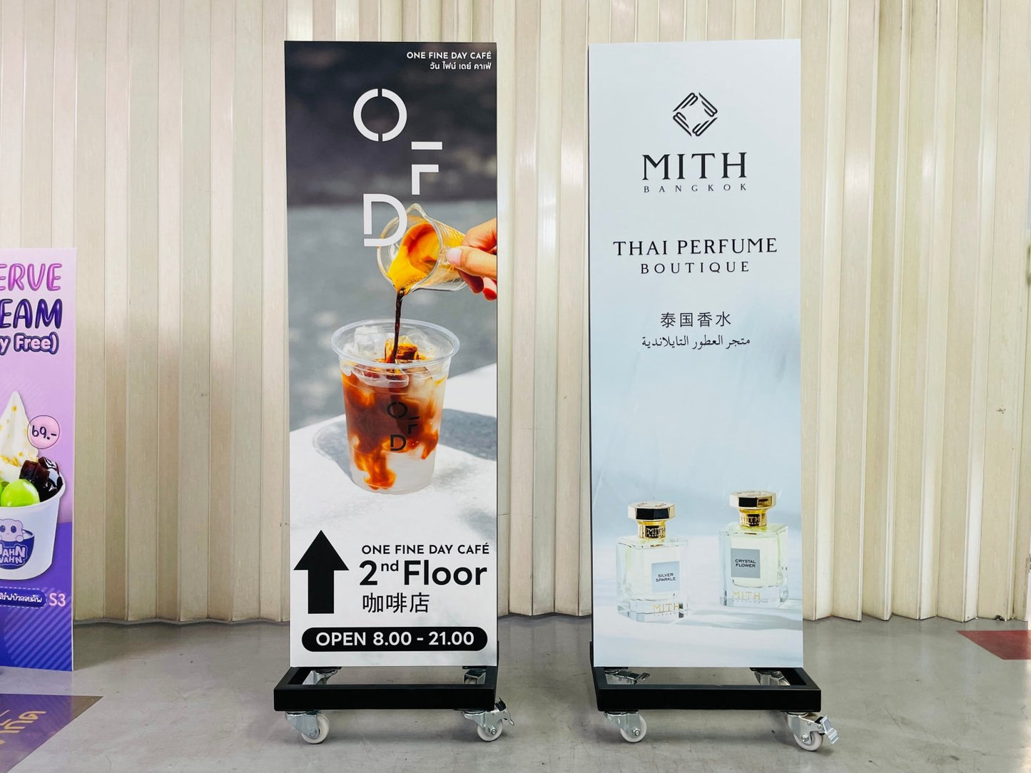 The scroll wheel is very popular. Almost every business will use a scroll wheel. in product promotion notify the location used to give directions used to inform Or various promotions. Most of the wheel signs are steel or aluminum frames. will weigh quite a lot but easy to move Resistant to weather conditions, not easy to fall, can lock the wheels to keep the sign in place.