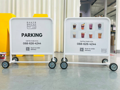 Get a wheel sign, a parking sign, a parking barrier, a wheel sign, a scroll sign, a sign in front of a coffee shop. sliding door sign Strong standard steel frame, durable wheels, easy to use, beautiful print, durable. weather resistant Can do both vinyl steel frame scroll wheel sign. wheeled light box sign Steel frame scroll wheel label with stickers