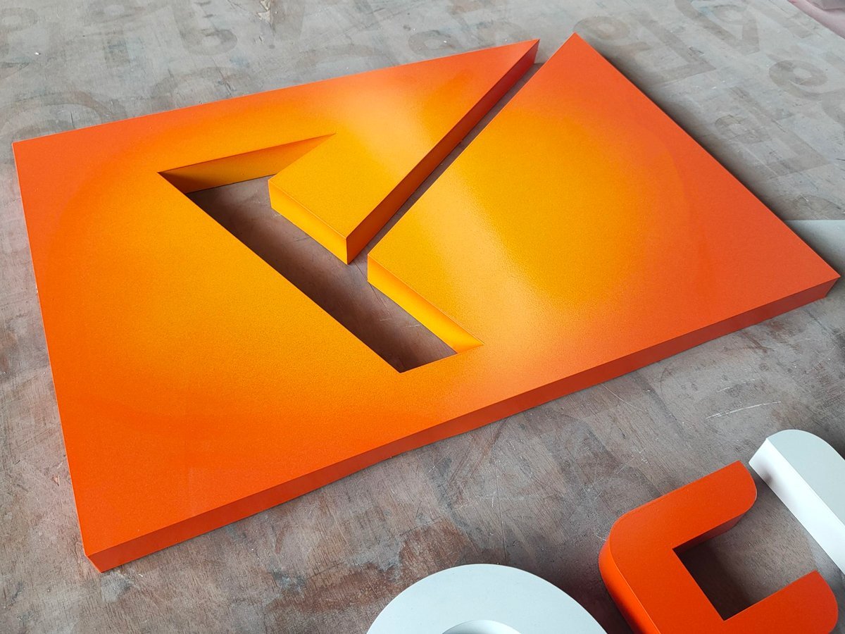 Logo sign, company sign, letter sign with color gradation technique. Help add dimension to make the logo stand out and unique. Logo signs can be colored in almost any material, whether it is a sync sign, stainless steel sign, plastic sign, acrylic sign, etc. Factors for choosing the material for making a sign include installation location, internal, external, budget, distance. usage time