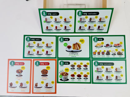 Accept printing of food menus, price tags, food menu signs, coffee shop signs, salad shop signs, menus for restaurants. Can be printed on a variety of materials. Popular materials in the restaurant business are food posters, future board menu signs, plastic wood menu signs, wall stickers, glass stickers, depending on the duration of use. Bright, clear colors with a variety of printing techniques, such as inkjet printed menu signs, UV printing, embossed printing, laminated and varnished menu signs, food images printed with UV curable coating. This technique helps make the image or food menu bright, clear, and look more dimensional than normal printing . Coated with varnish makes the image have a low relief dimension and helps coat the surface to prevent scratches on the printed image.