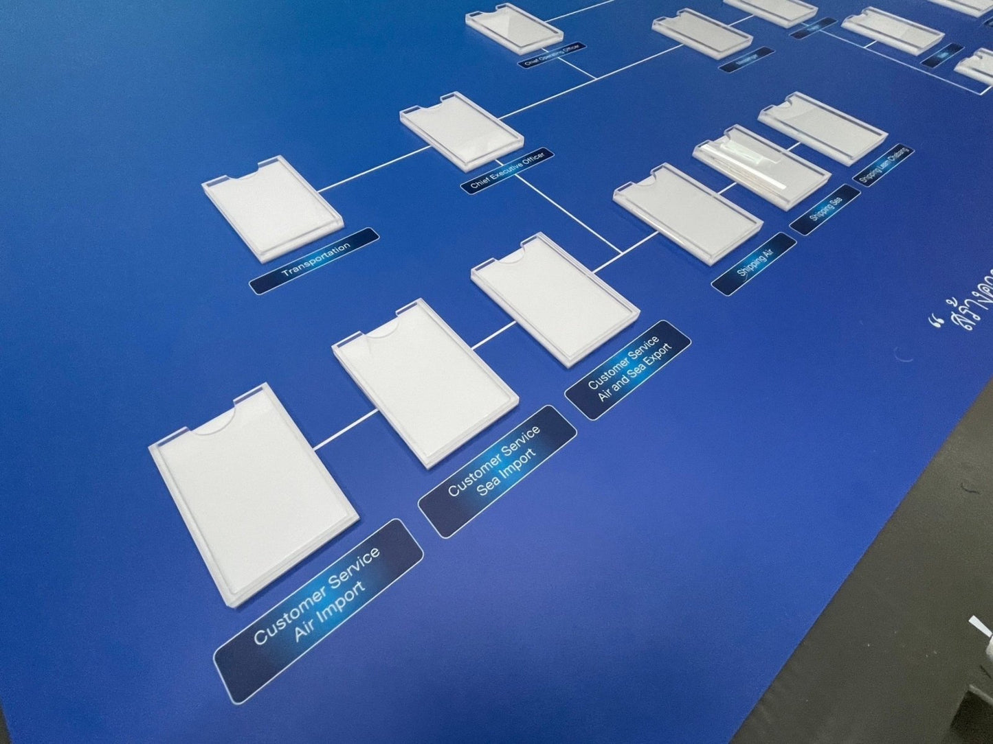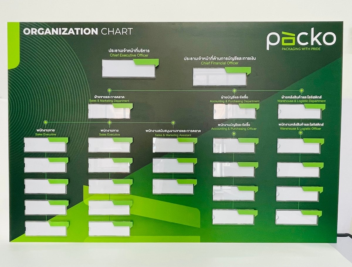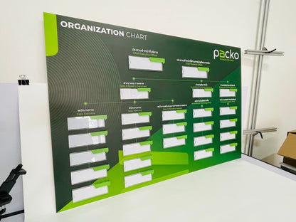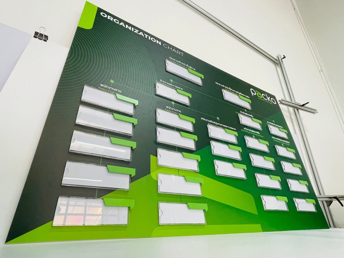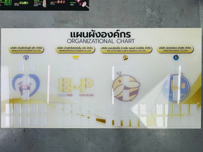Custom Organization Chart Boards for displaying company structures, management and employee listings, or as bulletin boards for internal announcements. Designed to match your corporate identity, with full service from design to installation.