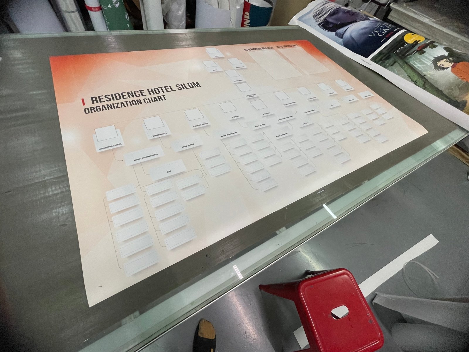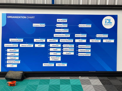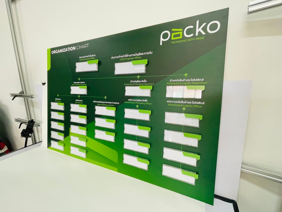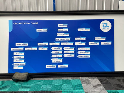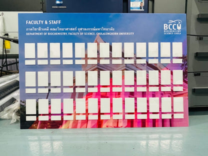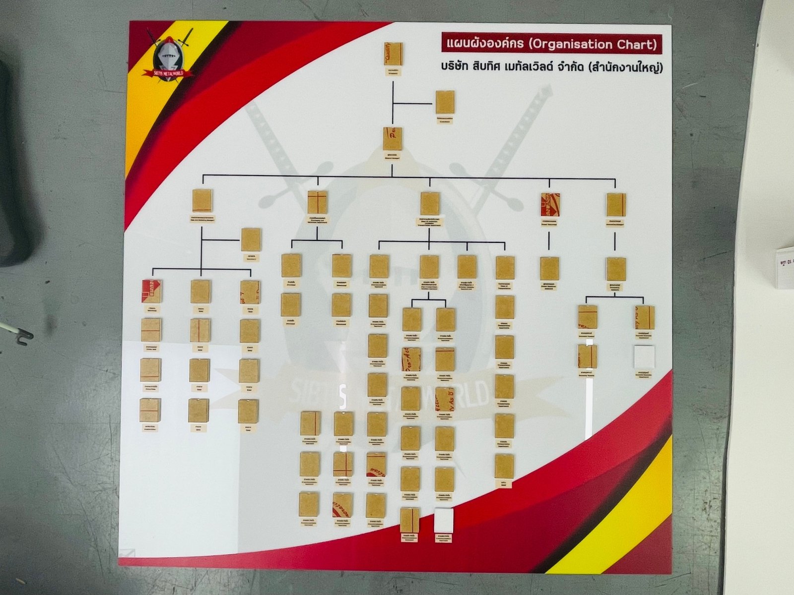 Custom Organization Chart Boards for displaying company structures, management and employee listings, or as bulletin boards for internal announcements. Designed to match your corporate identity, with full service from design to installation.