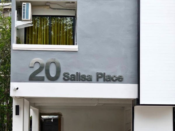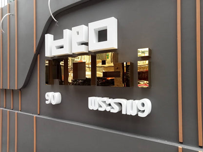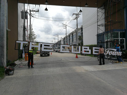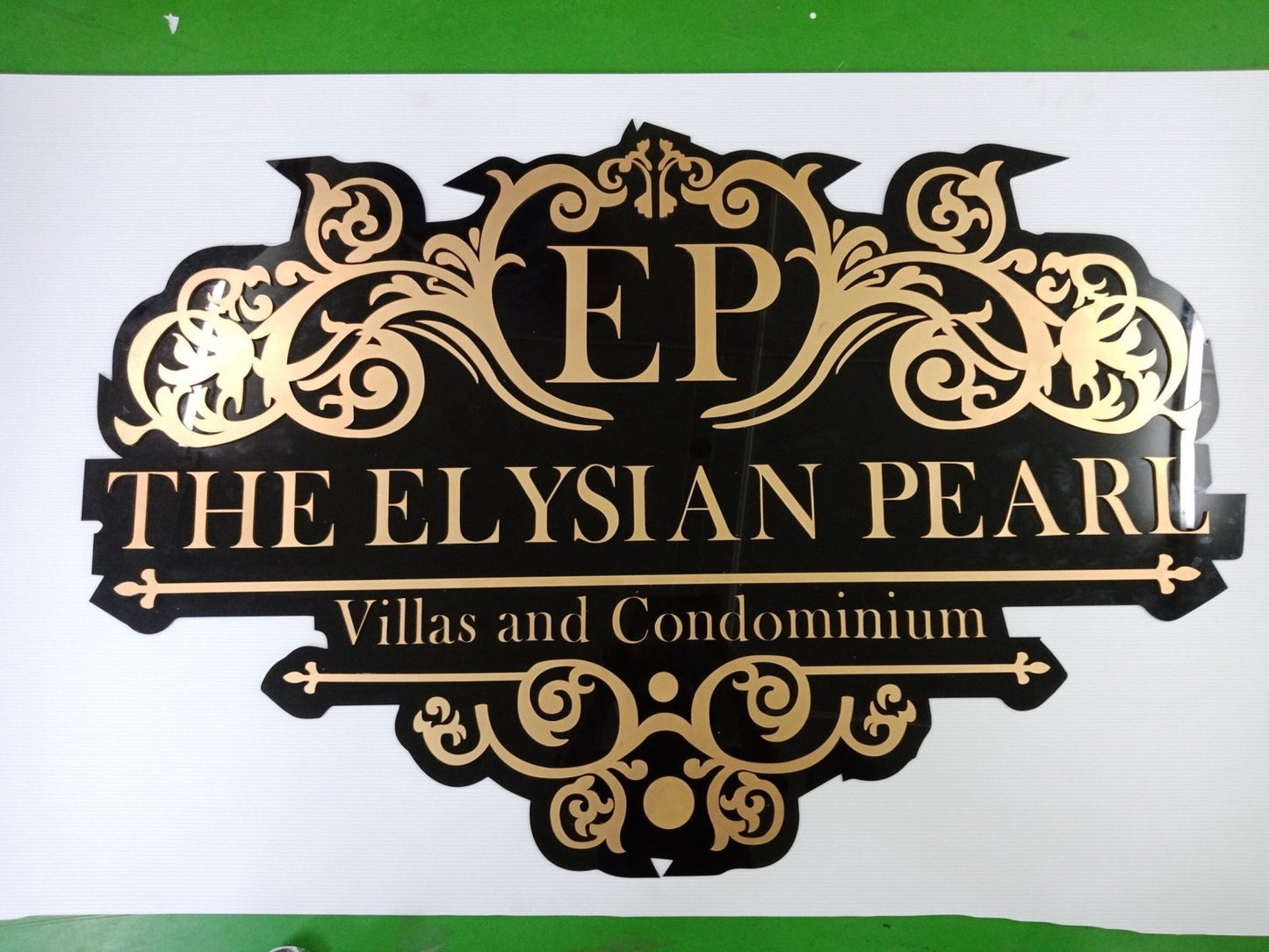 - Logo sign with die-cut acrylic letters installed in the condo. It is a hard plastic sheet of various thicknesses, durable, resistant to sun and rain, and can be installed outside the building.