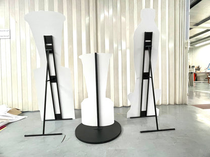 • Standee signs are easy to use. One person can install and store them. There are both butterfly stands and steel stands.