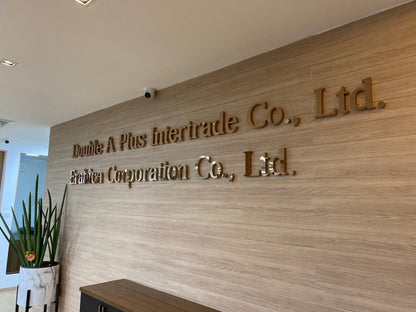 รับทำชื่อป้ายบริษัท ตัวอักษรสแตนเลสโรสโกลด์เงายกขอบ 1 นิ้ว กั้นหลังสำหรับติดชิดผนังลามิเนท
