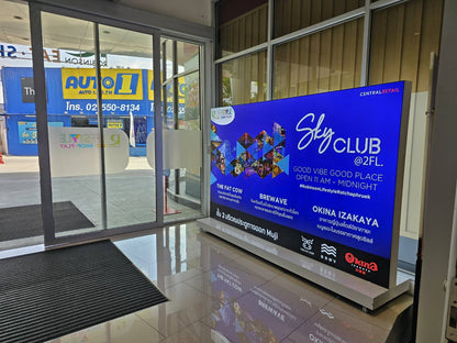 - ฐานตั้งป้ายล้อเลื่อน ทำจากโครงเหล็กหุ้มอลูมิเนียมคอมโพสิตพับเก็บงานอย่างดี มีล้อสามารถเคลื่อยย้ายได้