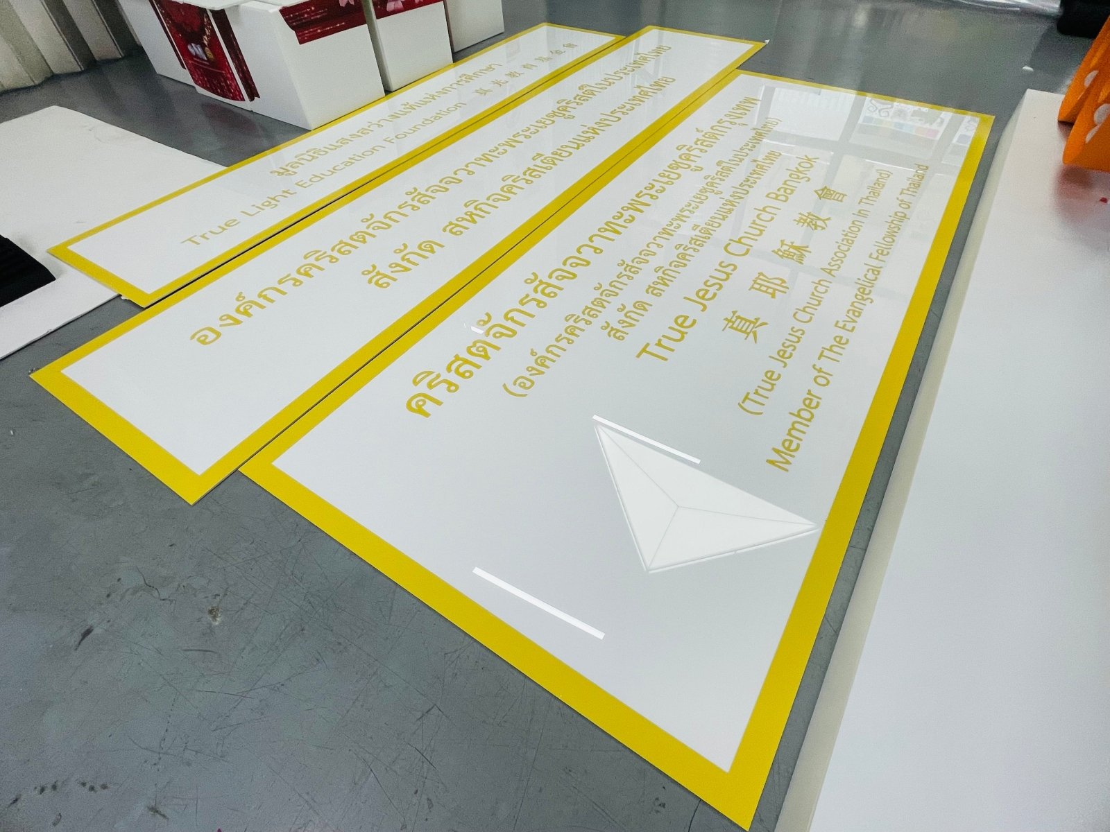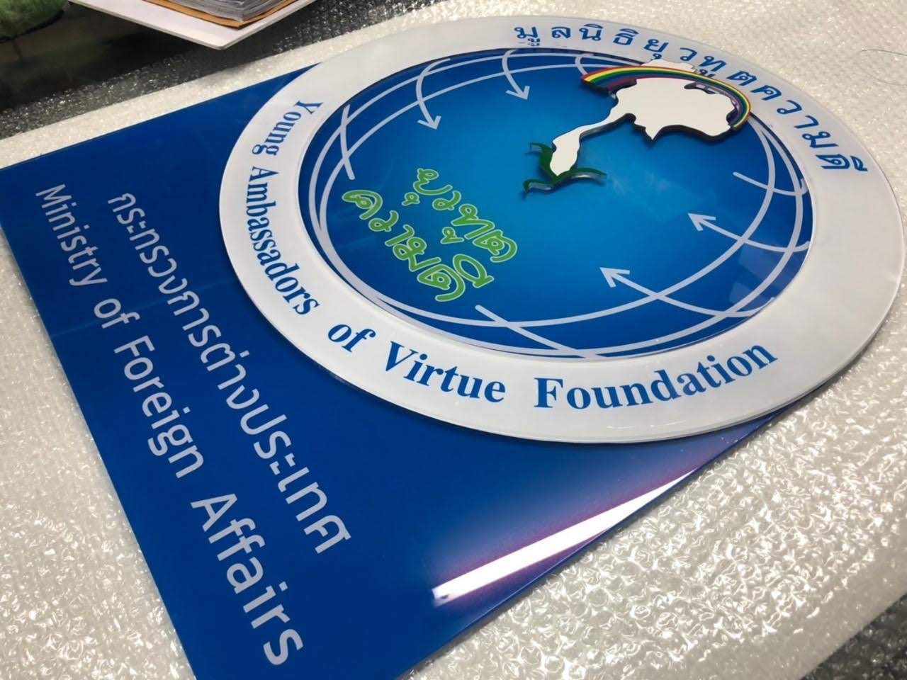 - ป้ายโลโก้ อักษรอะคริลิคไดคัท ติดในมูลนิธิ เป็นแผ่นพาสติกแข็งหลากหลายความหนา ทนทาน ทนแดด ทนฝน สามารถติดตั้งภายนอกอาคารได้