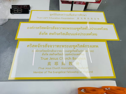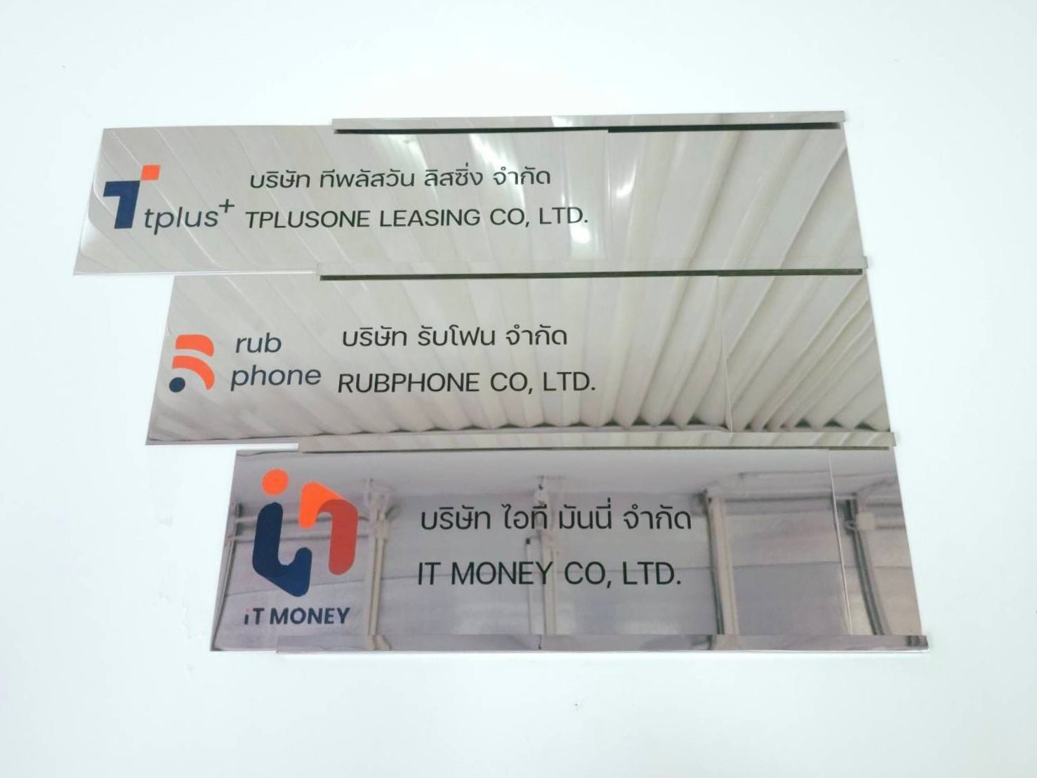 - ป้ายโลโก้ อักษรอะคริลิคไดคัท ติดในองค์กร เป็นแผ่นพาสติกแข็งหลากหลายความหนา ทนทาน ทนแดด ทนฝน สามารถติดตั้งภายนอกอาคารได้