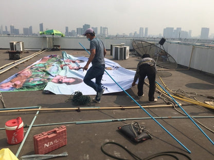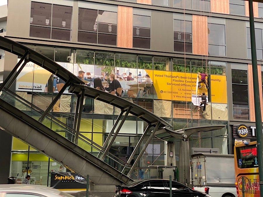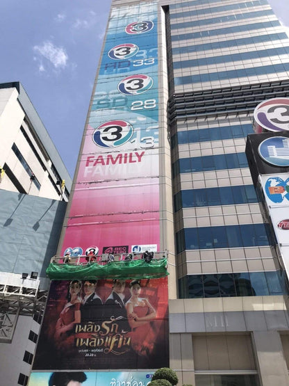 - งานติดตั้งป้ายไวนิลบนป้ายบิลบอร์ด อาคารสูงตึกสูง