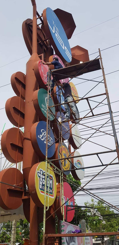 • ทีมงานมีความพร้อมในการเข้าติดตั้งป้ายหน้างานได้หลากหลายลักษณะ ทั้งพื้นที่ธรรมดา ที่สูงบนตึกอาคาร Facade หรือเสาป้าย Pylon Sign Billboard ต่าง ๆ