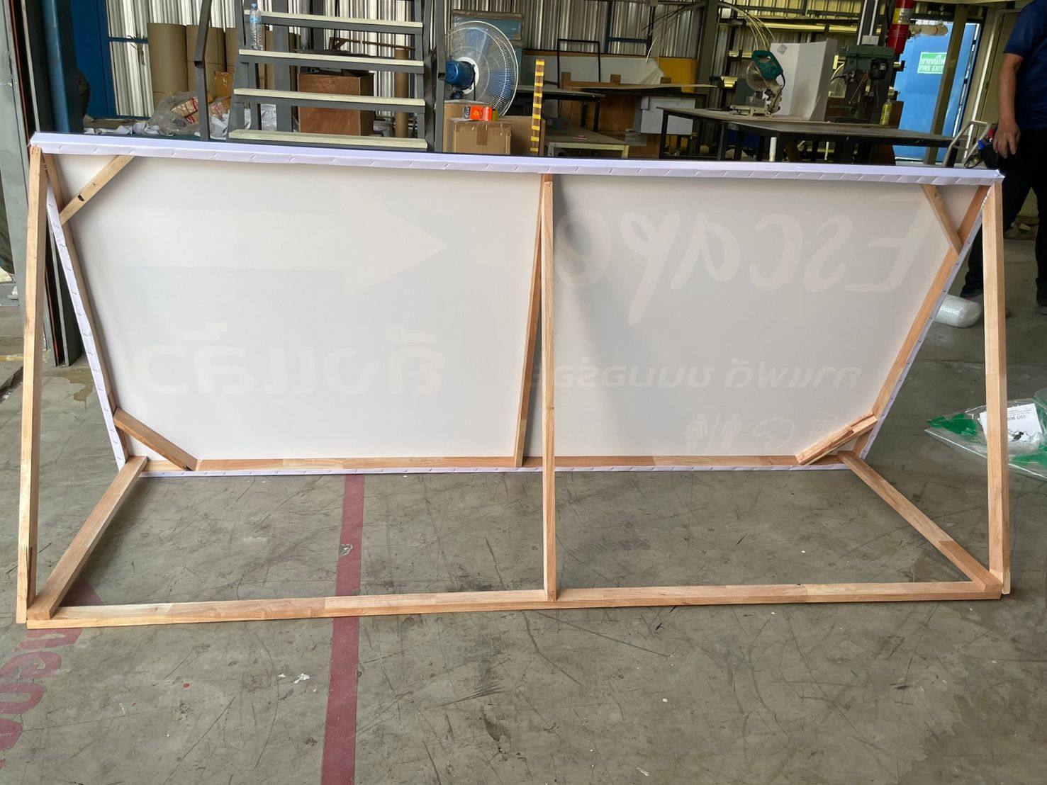 ขนาดกรอบมาตรฐาน: หน้ากว้าง 2–4 ซม. ปรับตามน้ำหนักและขนาดป้าย / งานภายนอก แนะนำทาเคลือบไม้กันชื้นเพิ่มเติม